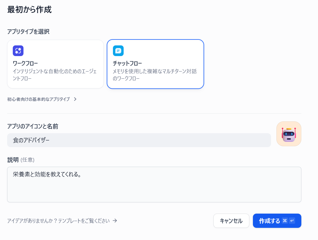 Difyにログインをして、最初から作成クリックし、チャットフローを選択。