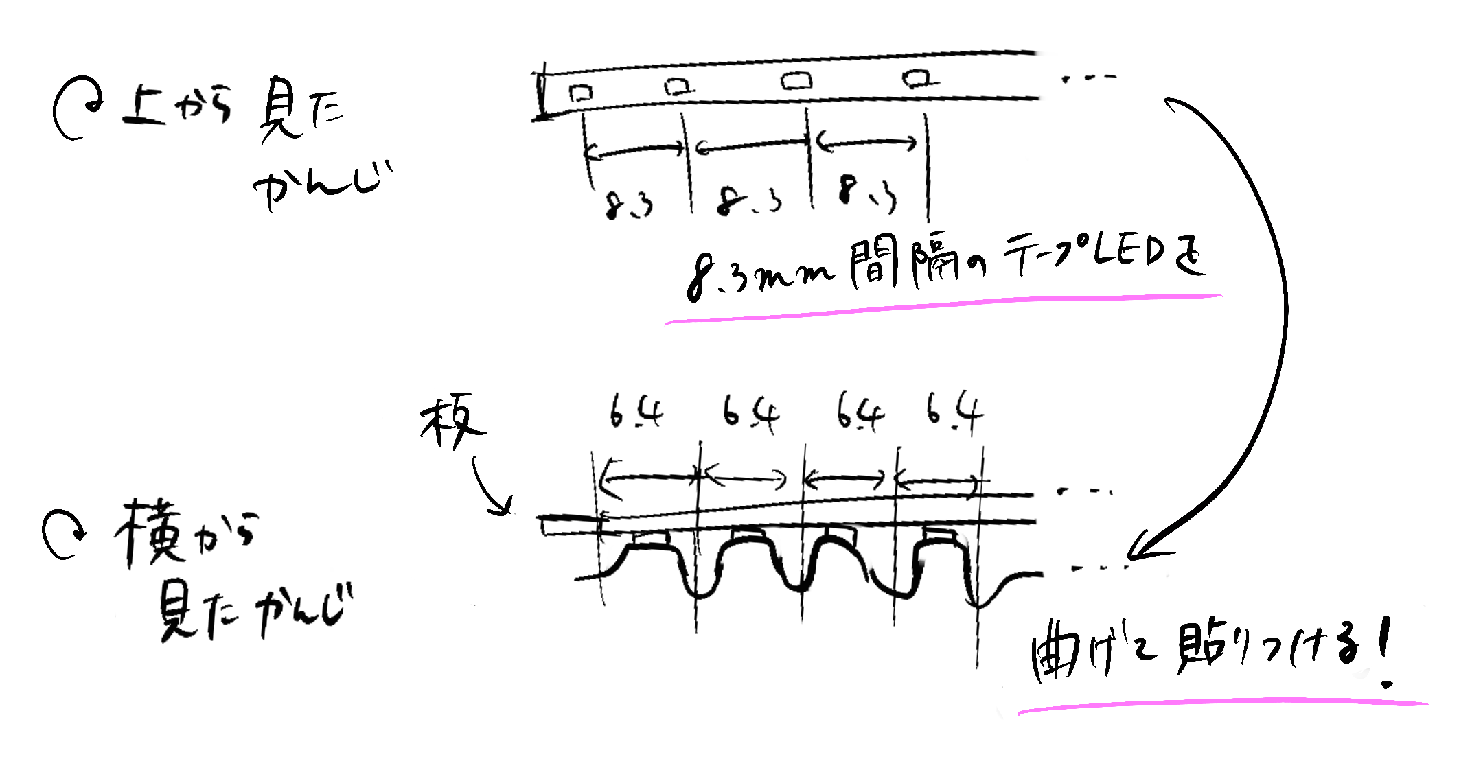 このテープは幅は4mmと細くて良いのですが、LEDの間隔が8.3mmほどあります。これだと6.4mm間隔で光らせることができないので、少々荒業ではありますが、LEDの間隔が狭くなるように曲げて貼り付けることにします。(以下わかりにくい図解)