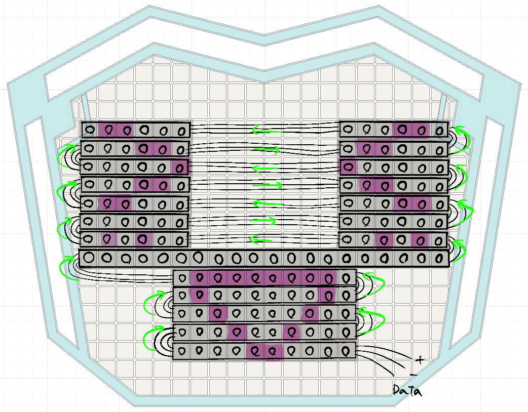 あとはArduinoからこの154個のLEDに対して 「n番目、m番目、o番目、p番目 … のLEDのをピンク色に光らせ、それ以外を消灯する」 という制御をする信号を送ることで表情のコントロールができそうです。