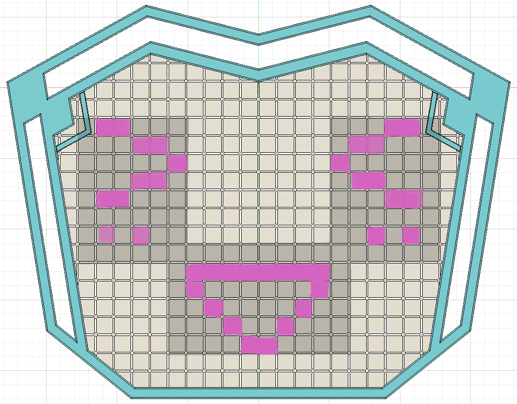 このマス目状の薄い板を3Dプリンタで造形し、その裏側にピンク色のLEDをうまく配置し制御することができれば、上記の必須要件 + 「前が見える」を満たす璃奈ちゃんボードの画面部分ができるはずです。