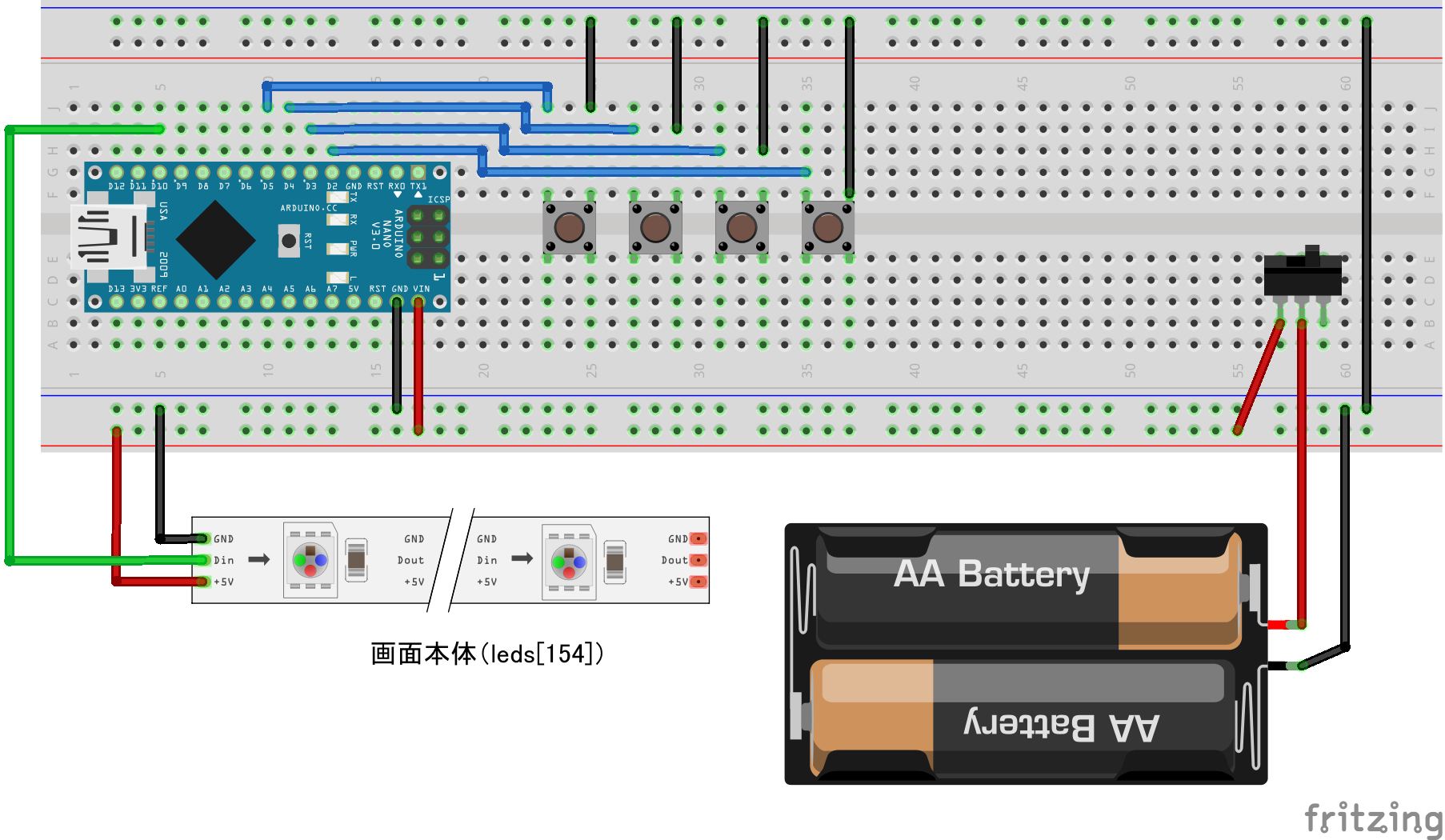 言ってしまえばArduinoにスイッチ4つとLED154個と電源を接続するだけなので回路自体はかなりシンプルです。ですが、(何度も繰り返して恐縮ですが)今回が初の電子工作だったので0から勉強しながらの設計でした。