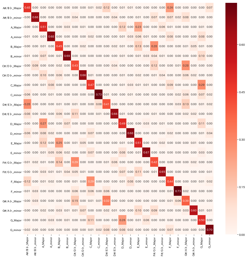 1段階目(平行調でまとめた12クラス分類)の予測精度は93%程度で良かったものの、2段階目の長調or短調で全体の正答率は下がってしまっています。