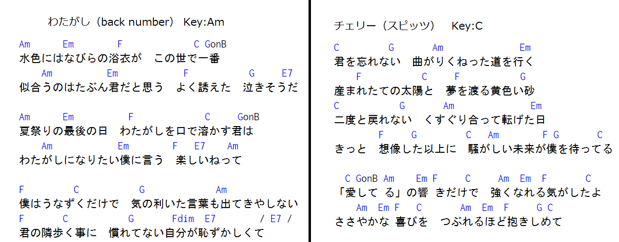 例えば、C(ハ長調)の平行調はAm(イ短調)です。必ず長調と短調が対応するようになっています。実際にコード譜を見てみましょう。