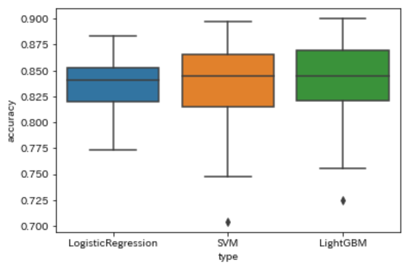どの手法でも最低正答率は70%以上となっています。ただ、ロジスティック回帰は他の手法に比べ、精度のバラツキ(範囲)が小さいことが読み取れます。