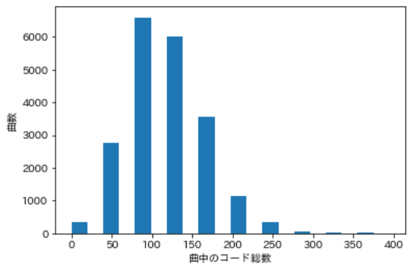 こうした楽曲は訓練データに相応しくないので、曲中の総コード出現数が20回以下のデータは落としてしまいます。また外れ値除去として、曲中の総コード出現数が250以上のデータも落とします。