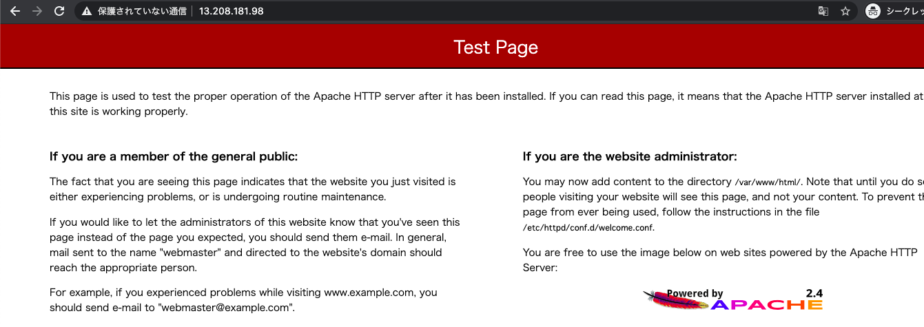 ブラウザ上でIPアドレスを入力してApacheのページの表示が表示されるまで