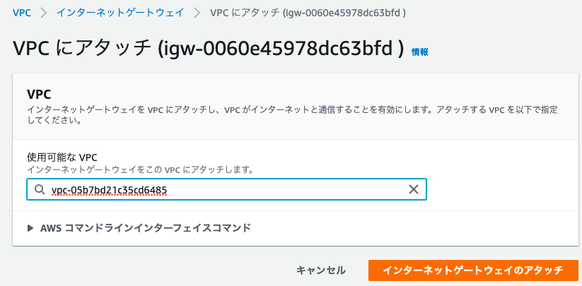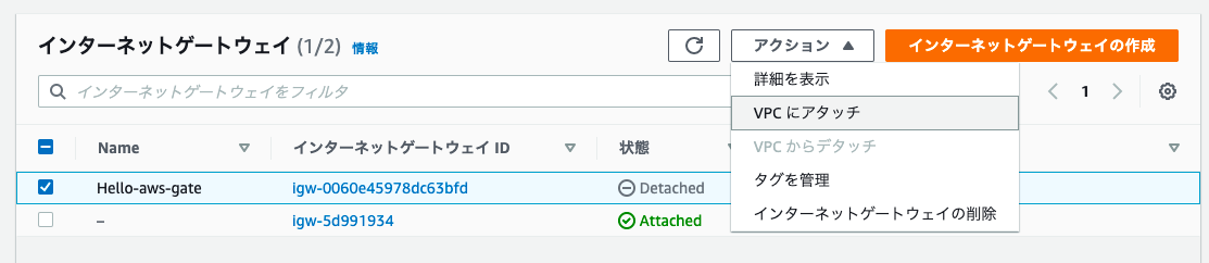 現在状態がDetachedなので作成したインターネットゲートウェイにチェックマークを入れ選択した後アクションからVPCにアタッチを選択します。