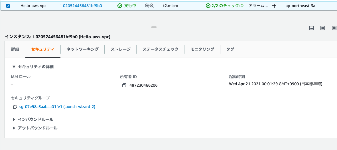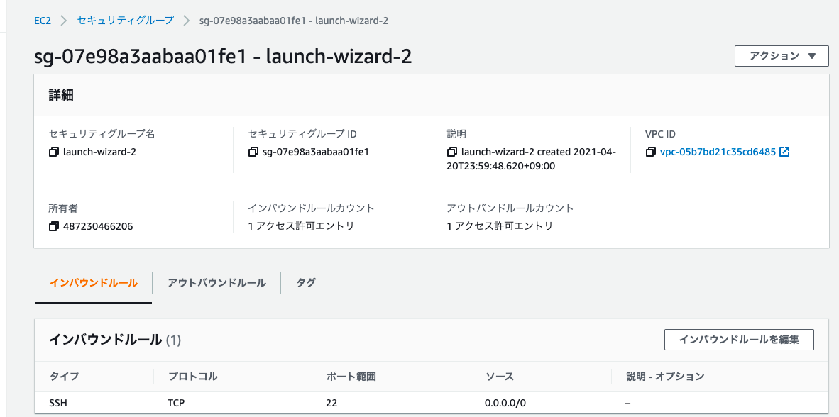 インスタンスを選択しセキュリティからセキュリティグループをクリック