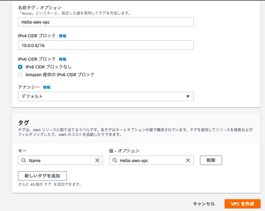 ここではVPCの設定を行います。名前タグの所は自由に入れて大丈夫です。入力したらVPCを作成をクリックします。
