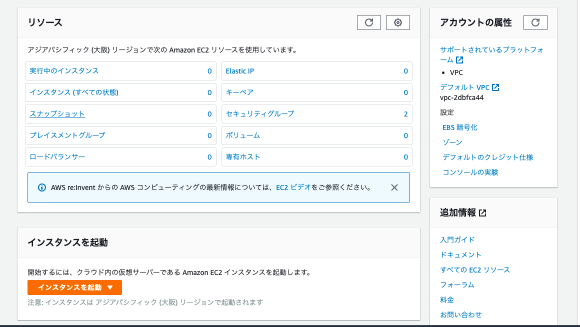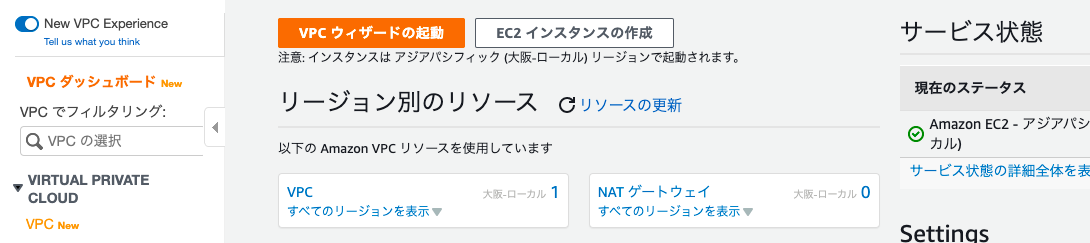 アカウント名の右にあるリージョンを東京または大阪にします。この記事は大阪でやってます。