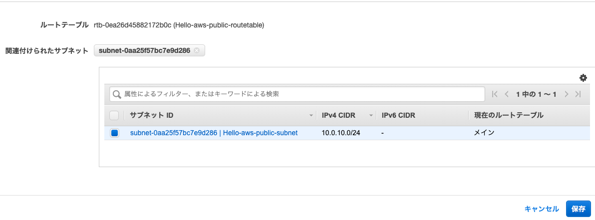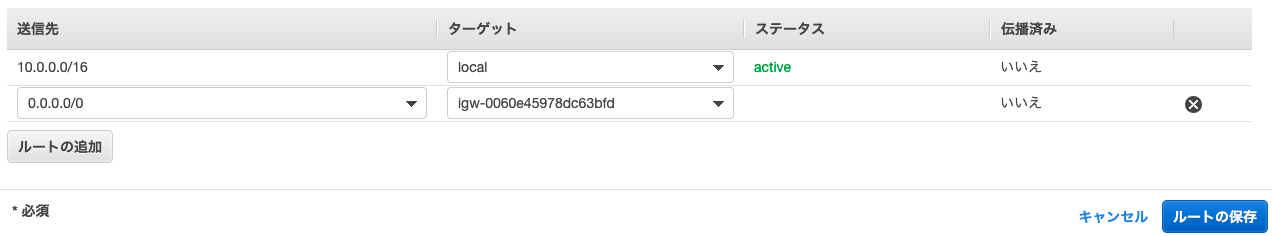 目的のIPアドレスが0.0.0.0/0(10.0.0.0/16の範囲に含まれない場合)インターネットゲートウェイに向かうようにしてルートの保存を選