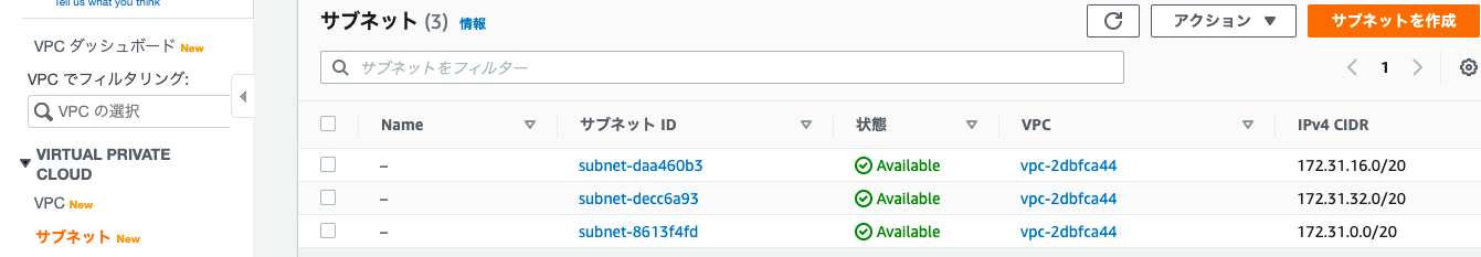 検索欄でサブネットと入力するとこのようなページに飛ぶので右上のサブネットを作成をクリックします。