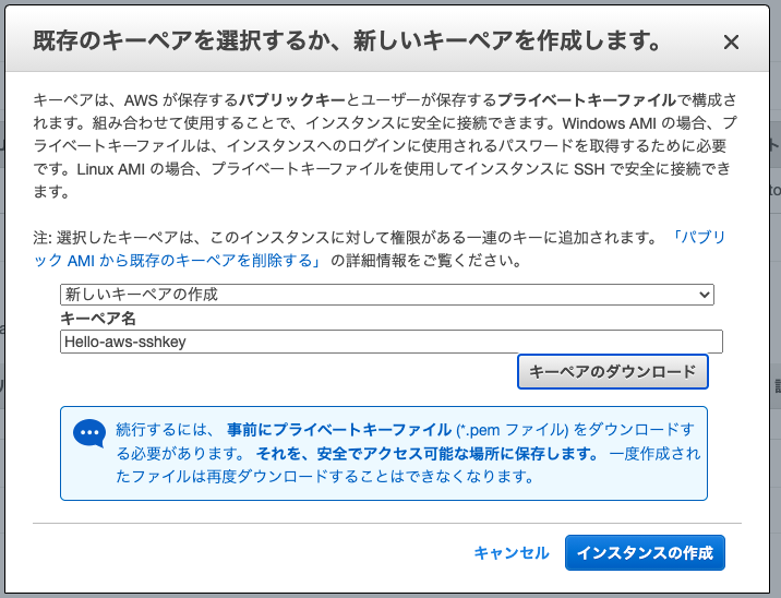 すると以下のような画面になるので画像のように入力しキーペアのダウンロードをクリック。このキーペアはサーバーにSSHでログインする際に使用します。ダウンロードできたらインスタンスの作成をクリック