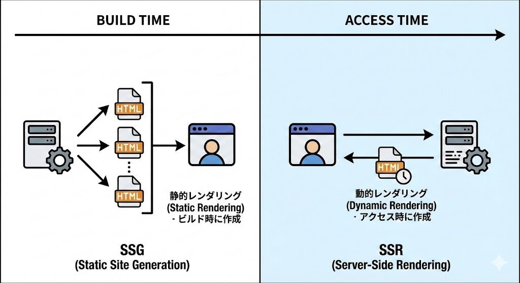 ビルド時に HTML を先に作っておき、アクセス時は 完成済みHTMLを配信するだけ