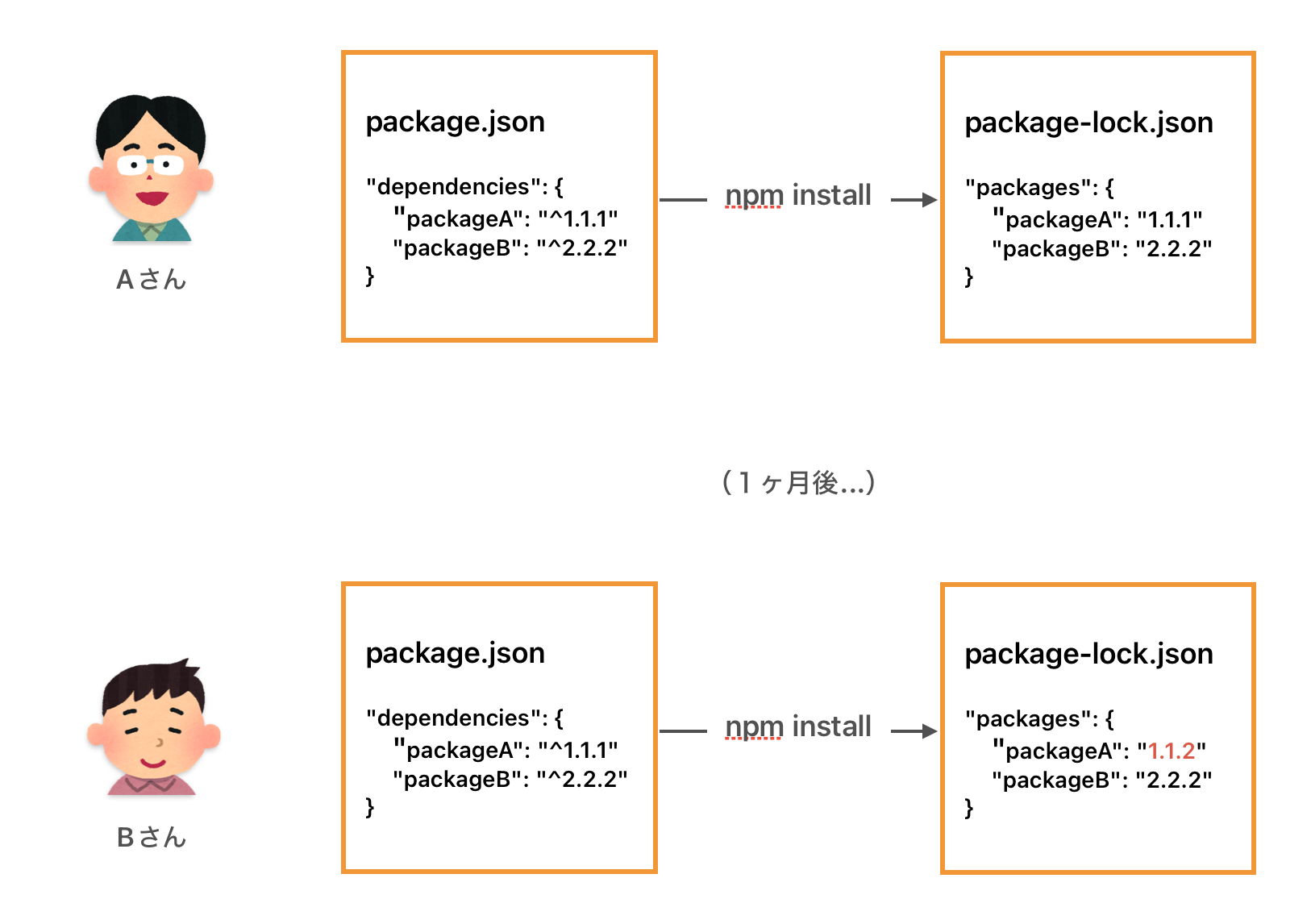 この時、npm installでの運用だと、例えば以下のように開発者間で使用バージョンの差分が発生します。
