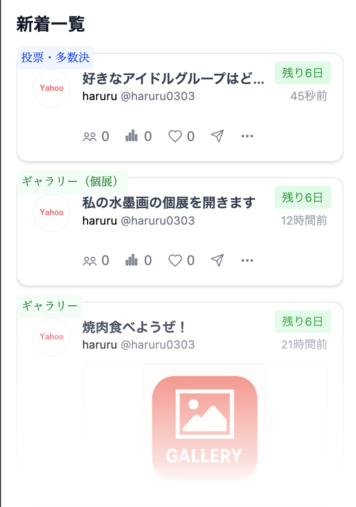 既存SNSとは違い、様々な種類のスタイルで投稿できるようにすることで、多様なコンテンツ創出の場を目指します。今実装している例だと、投票とギャラリーがあります。今後、この種類を定期的に増やしていくことで、一つのプラットフォームで、飽きずに多様なコンテンツを表現できるようにします。