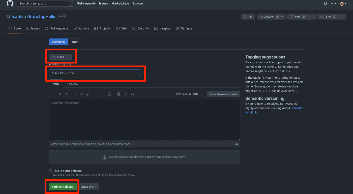 その後に、実際にタグをつけてリリースとしてファイルをまとめてみましょう。