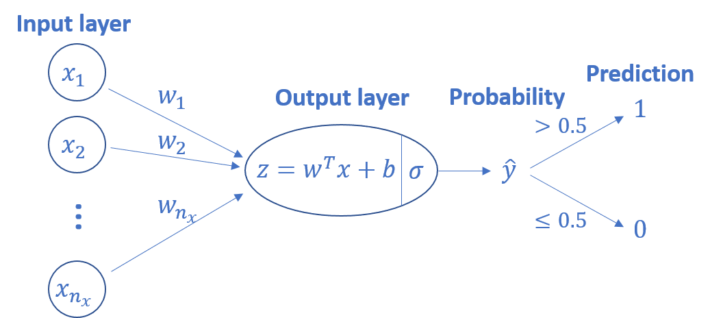$\sigma \left( z \right)$ はロジスティクス回帰における活性化関数 (Activate Function)であり、シグモイド関数、あるいはロジスティック関数と呼ばれる活性化関数が使われます。$w$ は入力に対するウェイトであり、$b$ はバイアスです。