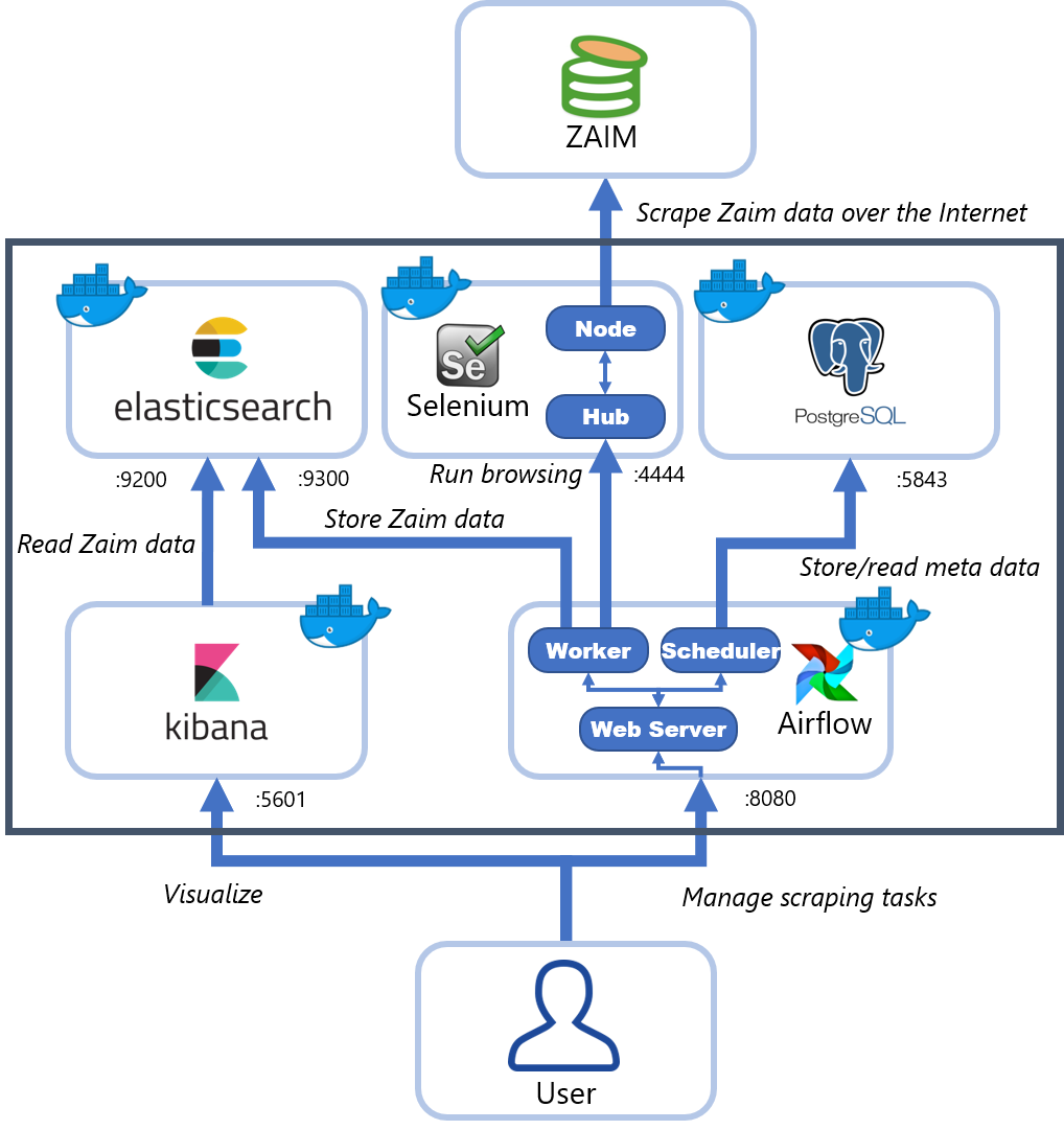 上記の変更に伴って、システムアーキテクチャは下図のようになっています。基本的にはユーザー側はKibanaとAirflowのWeb UIだけ使えば十分です。