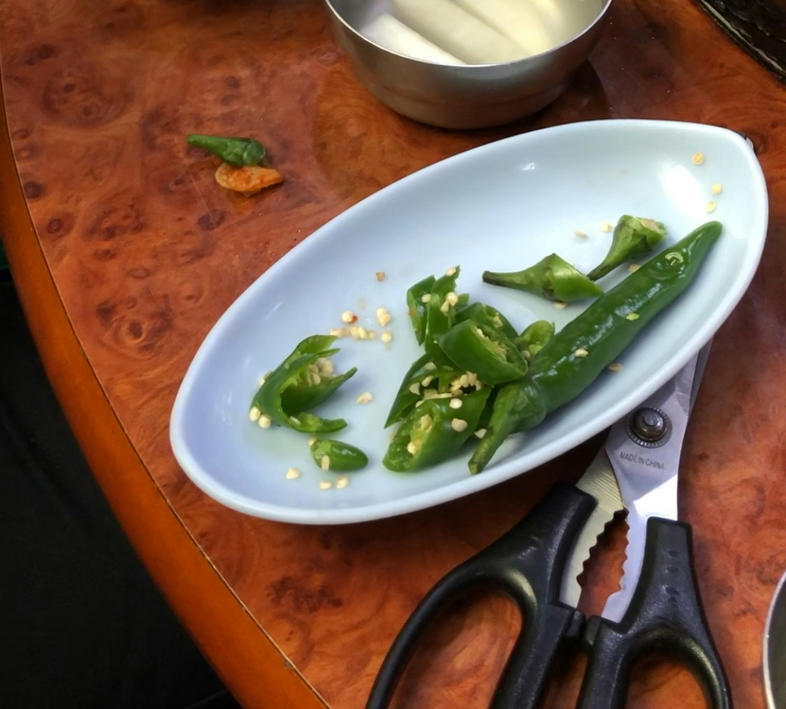 このタッカルビも十分に辛かったのですが、韓国では唐辛子を下さいとお願いすると日本のネギのノリで青唐辛子を出してくれたりします。