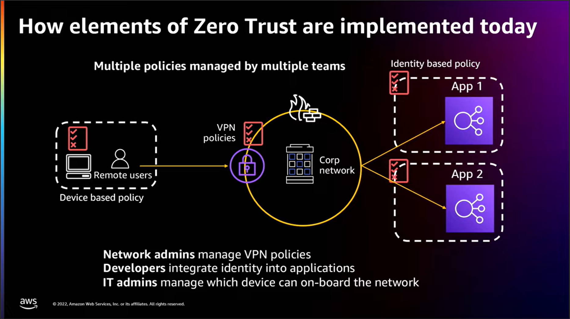 こういった実装におけるユーザーの課題は複数の接続ポリシーを管理する必要があり、さらには担当者も別々に存在し、管理が複雑になるこということです。これを解決するサービスが AWS Verified Access です。
