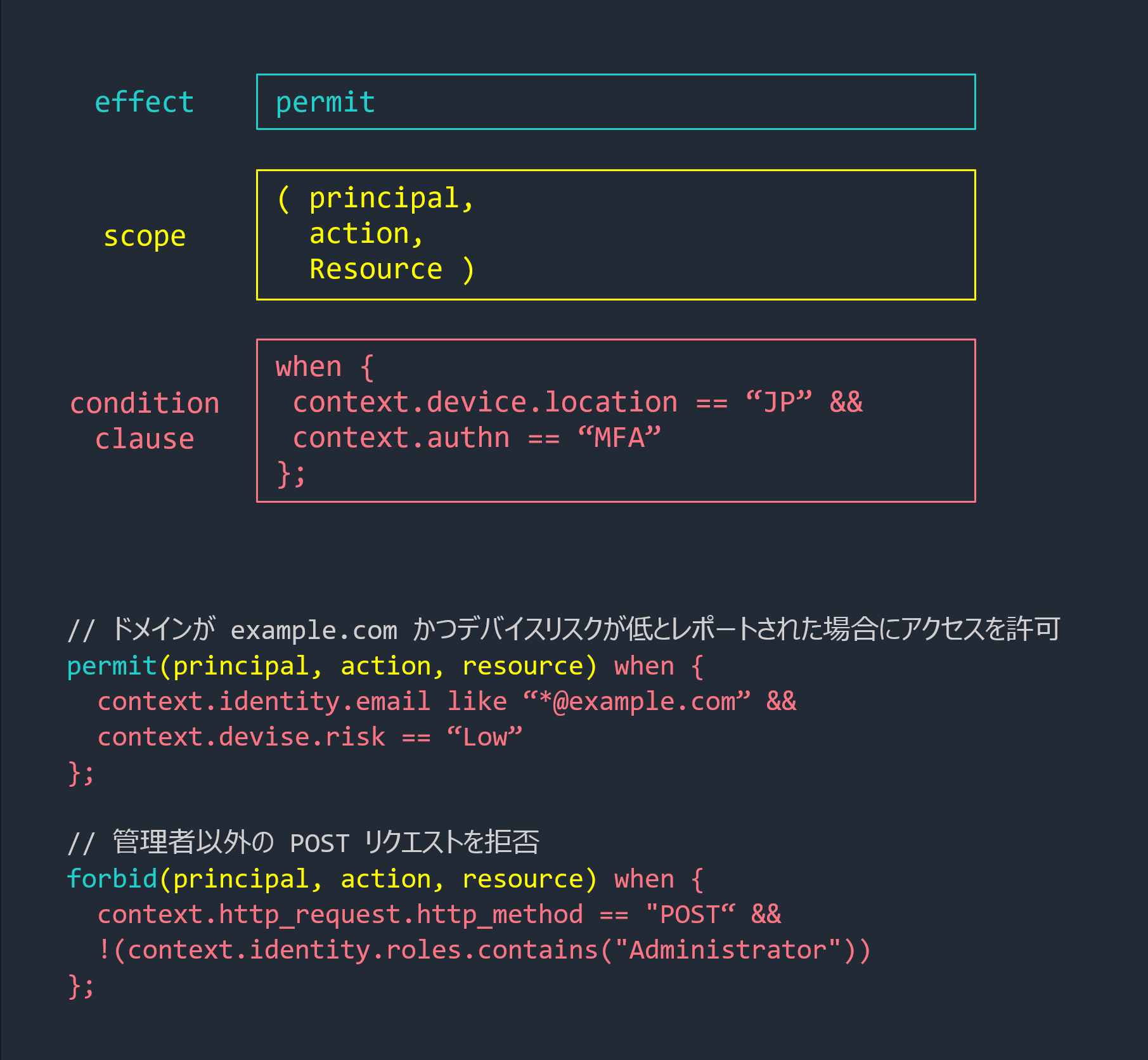 Access Policy は AWS が開発した Cedar (しーだー) と呼ばれるポリシー言語で記述する必要があります。