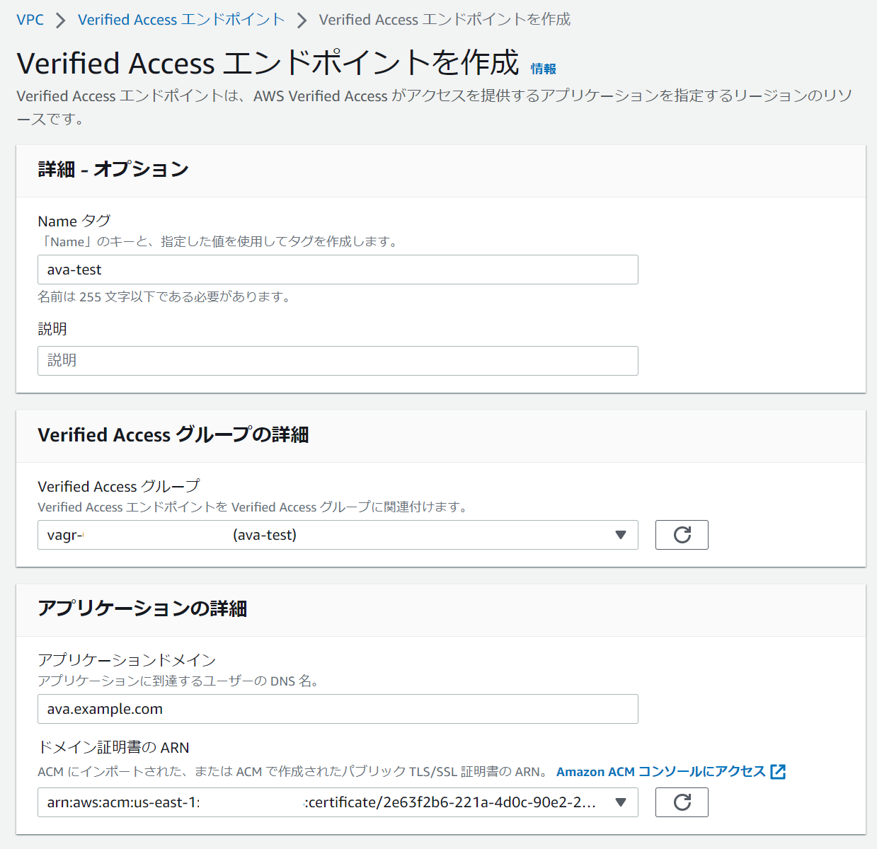 エンドポイントを作成すると、<endpoint_domain_prefix>.edge-xxxxxxxxxxxxxxxxx.vai-xxxxxxxxxxxxxxxxx.prod.verified-access.<region>.amazonaws.com といった形式のエンドポイントドメインが払い出されます。この値をアプリケーションドメインに対する CNAME レコードとして登録します。