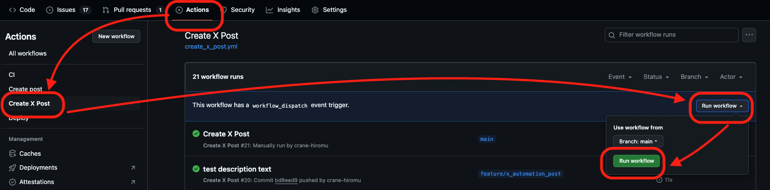 GitHub Actions で取得した値を使いたいので、X_POST_MESSAGE というものを作って渡すようにしていますが、メッセージが固定なのであれば、これは特に必要ないです。