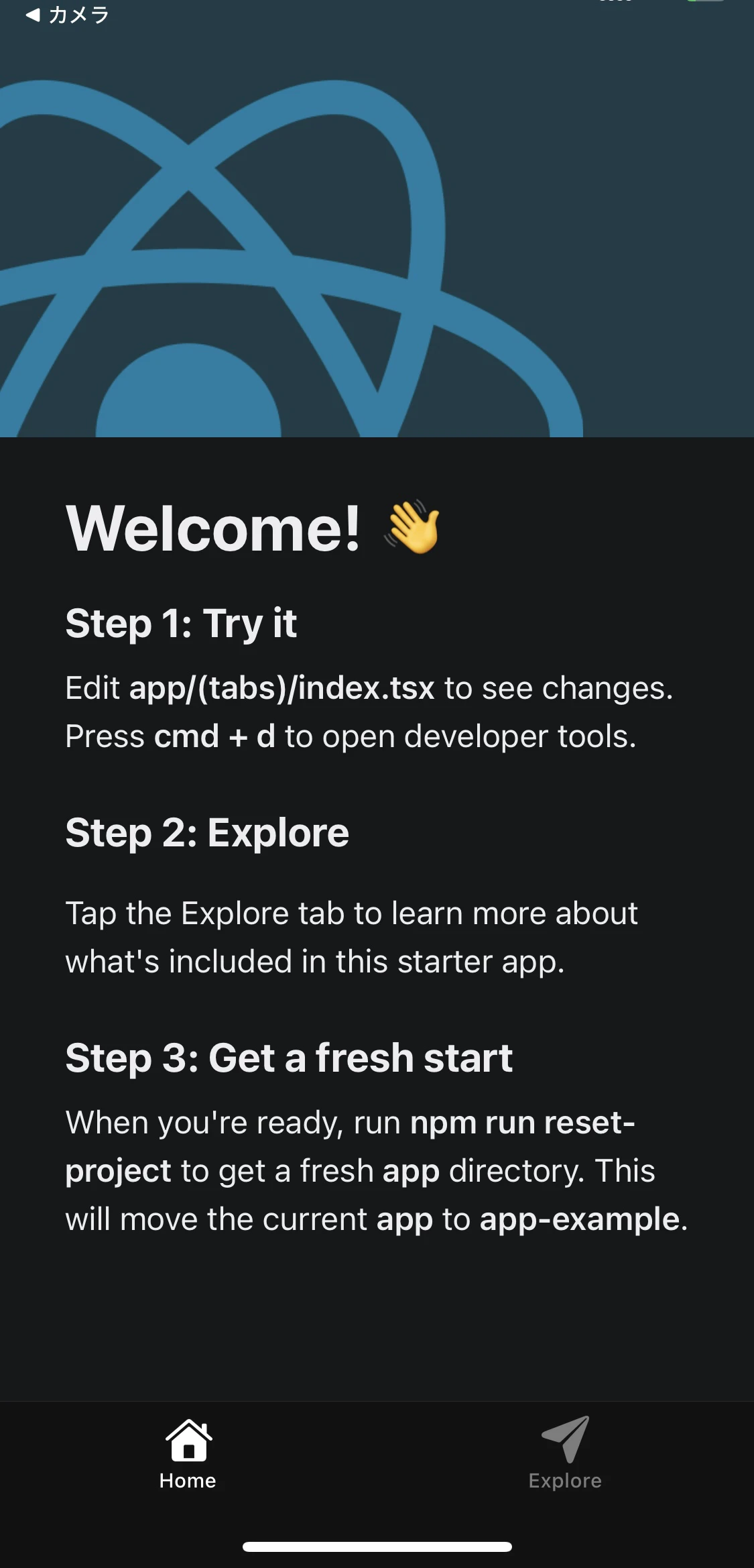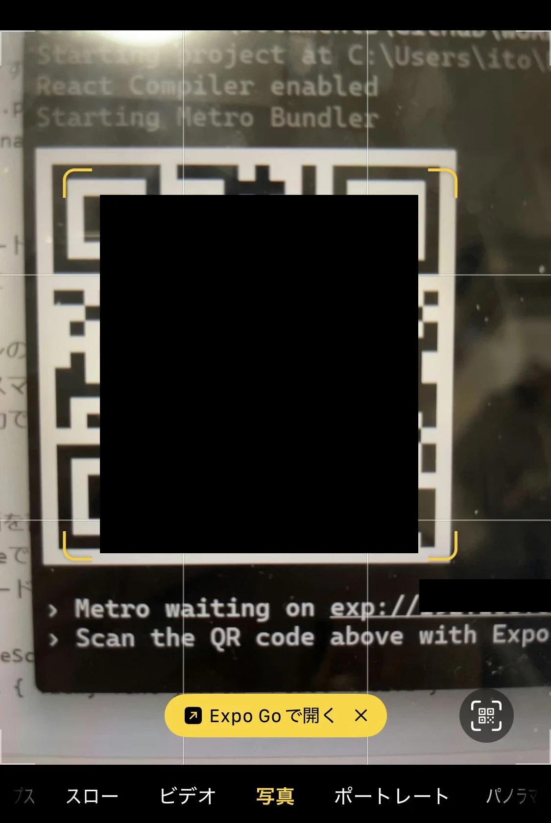 まだ何もコードを書いていませんが動かせます。コマンドプロンプトにさらにコマンドを書きましょう。npx expo start