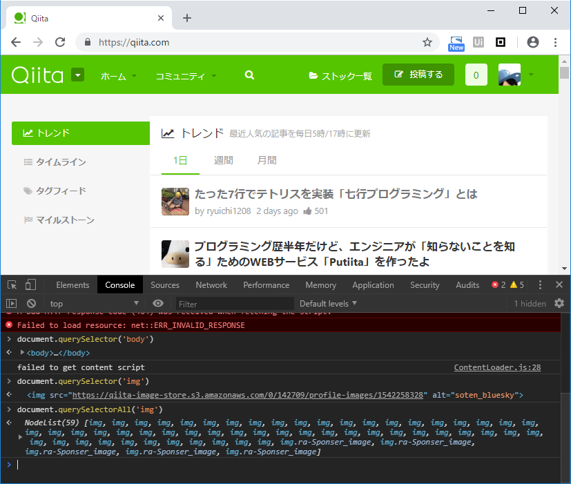 1つのimg要素が探索できていると思います。この例ではQiitaログイン後のページで実行していますが、自分のアイコン画像を表示しているimg要素が探索できているようです。