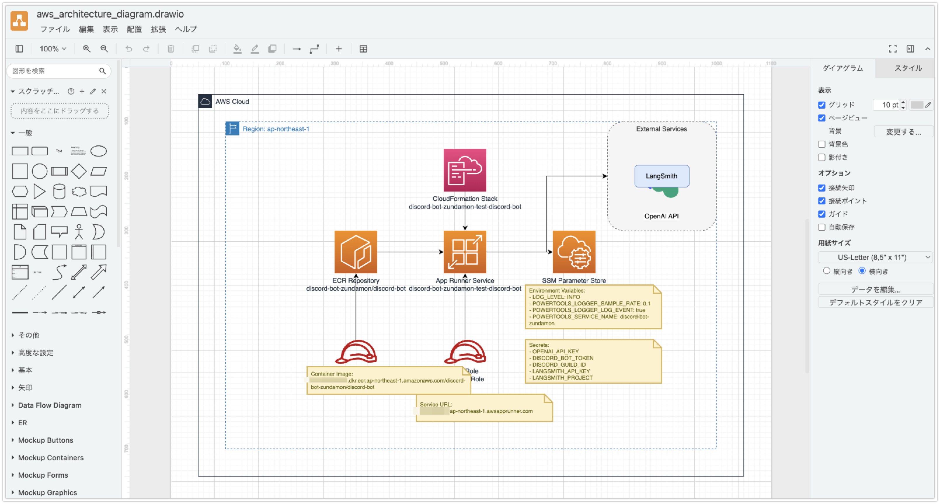 以下のようなシステム構成図が生成されました。そのままを利用するのは微妙ですがdraw.io形式で出力されているので、draw.ioで開いて修正することができます。