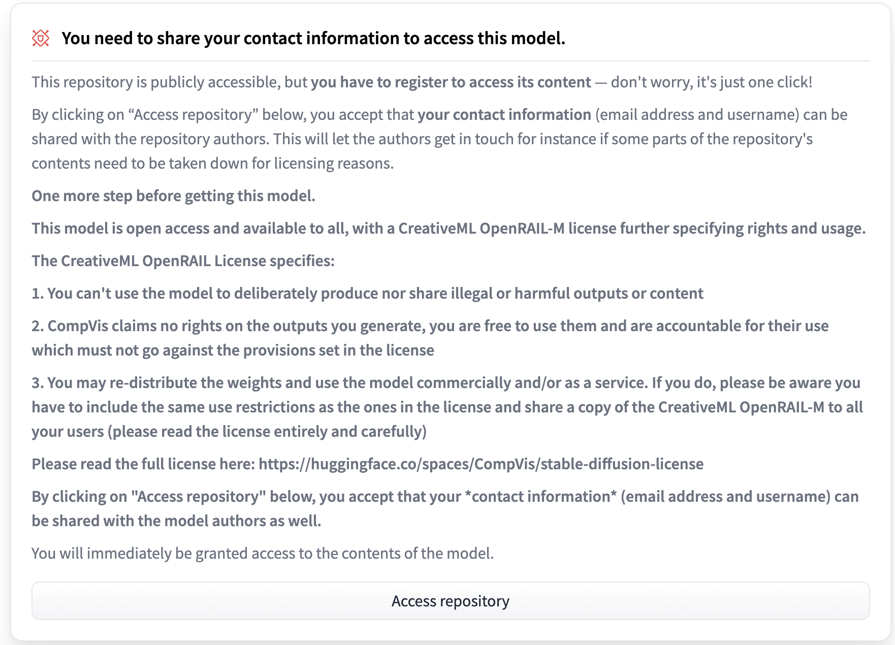 以下の Stable Diffusion のページにアクセスするとリポジトリへのアクセス確認がされるため、まずは Hugging Face にアカウントを作成してログインし、利用規約に合意します。