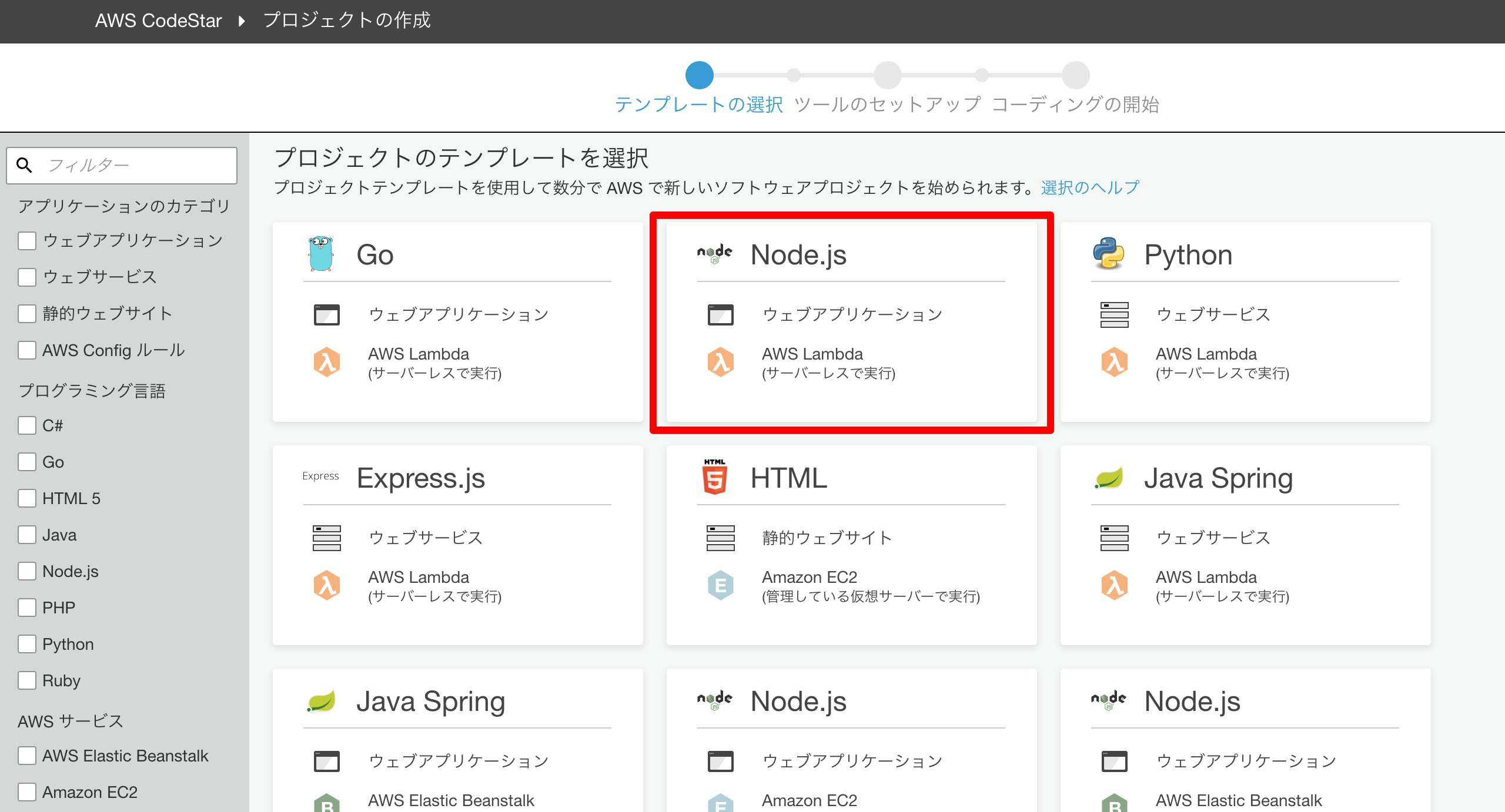 使用するのはAWS CodeBuildとAWS CodePipelineだけなのですが、それだけのテンプレートは存在しないので、作成されるリソースが少ないNode.js/AWS Lambdaを選択します。