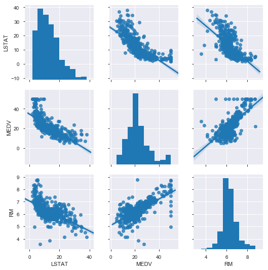 予測したいMEDVに相関の高いLSTAT、RMについてもう少し詳細に見てみます。