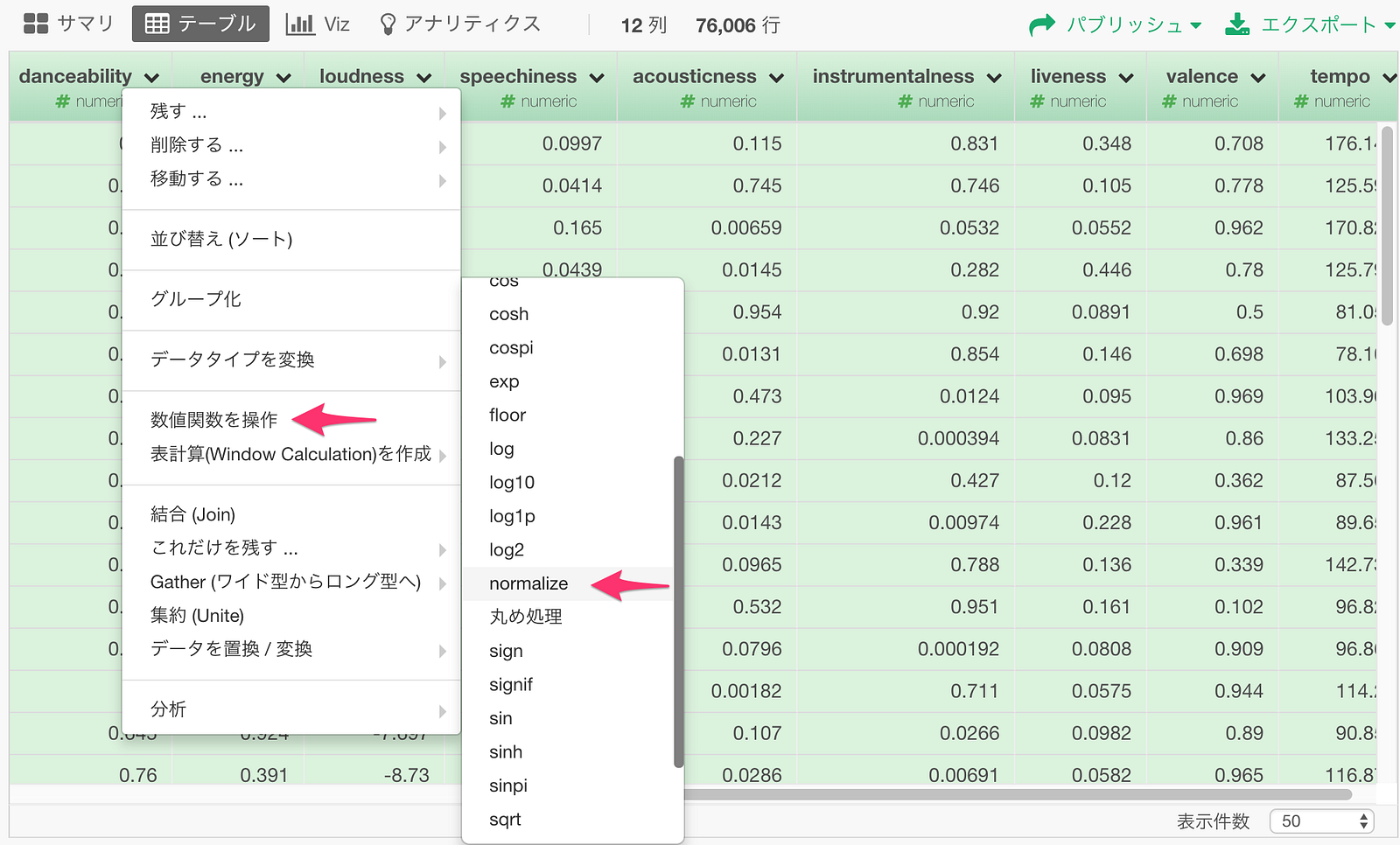 一つ一つの列に対してやるとめんどくさいので、いっぺんに全ての属性の列に対してやってしまいましょう。danceabilityからtempoまでをCommandキーをクリックしながら選択し、列ヘッダーメニューから”数値関数を操作”