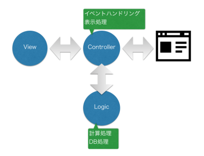 などがあります。ビューが絡むとテストがとても面倒になりますが、ロジックには表示処理がないのでユニットテストが書きやすく、品質も保証しやすくなります。また、似たような処理があった場合にコントローラ内部に処理があるとビューと結びついてしまって再利用がしづらいですが、ロジックは切り離されているのがメリットです。