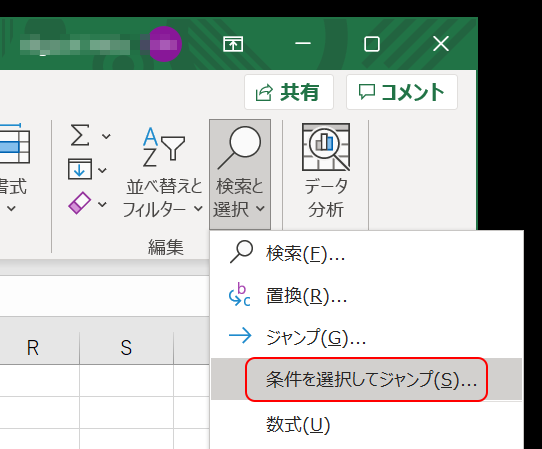 2.[ホーム]>[検索と選択]>[条件を選択したジャンプ(S)]