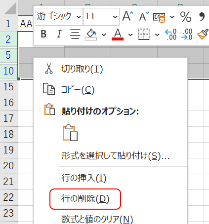 10.選択したデータだけがフィルタされるのでその行を選択して右クリックから[行の削除(D)]を実行します。