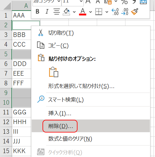 4.空白のセルが選択されるので、選択されたセル上で右クリックして[削除(D)]する(上手に右クリックしないと選択が解除されるので注意!)