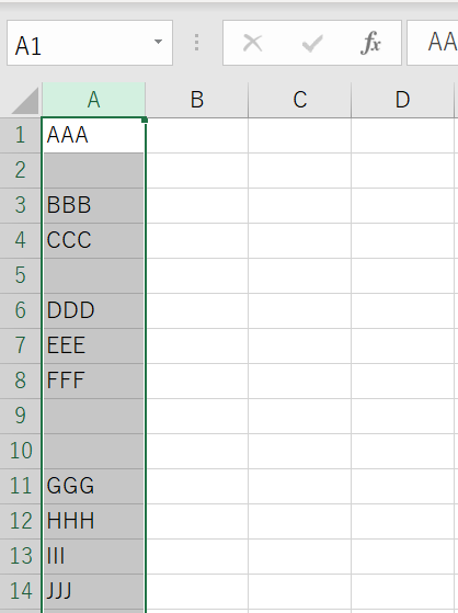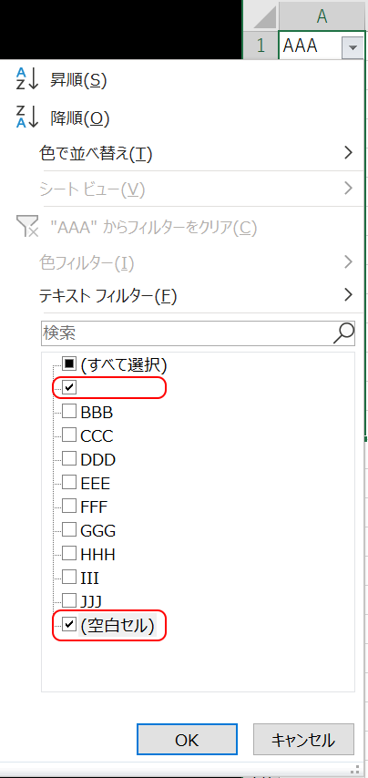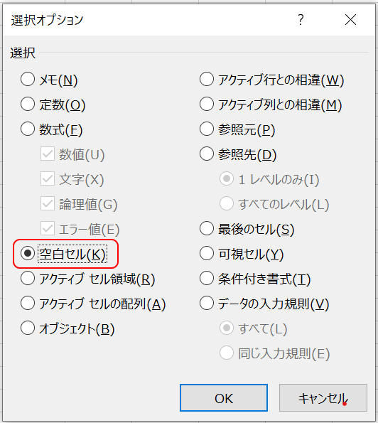 ところが、セルに半角スペースや全角スペースが入っていると[空白のセル(K)]では上手くいきません。