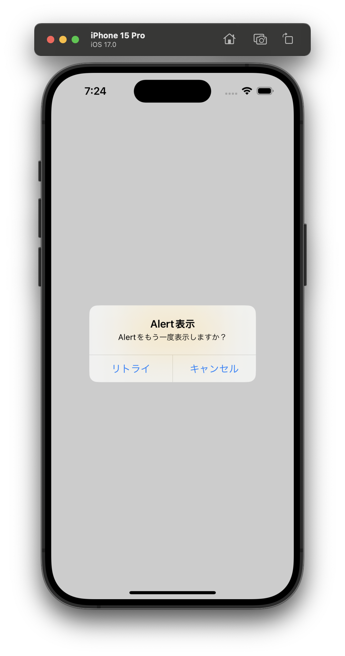 let alert = UIAlertController(title: "Alert表示", message: "Alertをもう一度表示しますか?", preferredStyle: .alert)