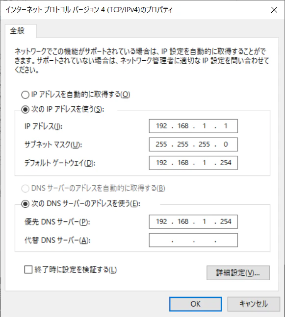 再度「インターネットプロトコルバージョン4のプロパティ」を再設定して[OK]ボタン押下後は、