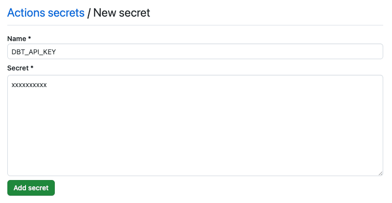 Name にはDBT_API_KEY、Secrets には作成したTokenを入力し、「Add secret」ボタンを押せば完了です。