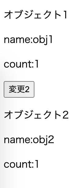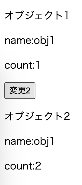 オブジェクト2は、オブジェクト1と同じようにnameがobj1になり、countは1増えて2になりました。想定どおりです。