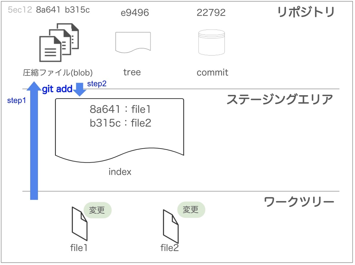 step2. ステージングエリアのindexにfile1, file2とblobオブジェクトの紐付けが記録される。
