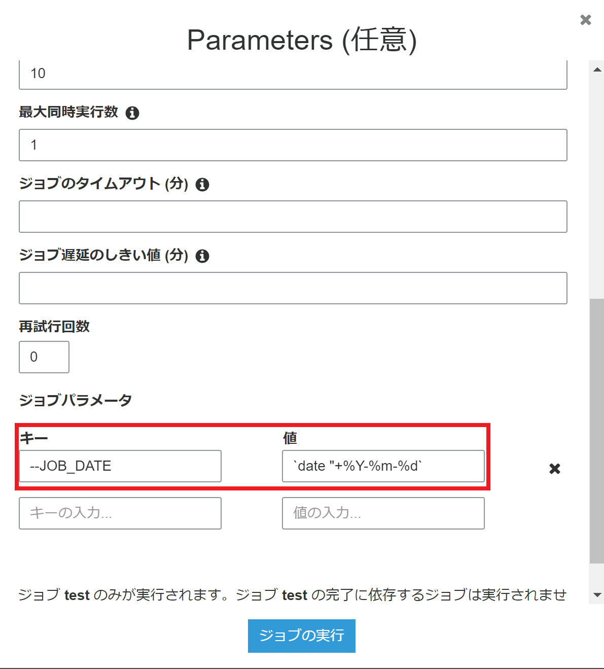 Glue の内部での実行環境は linux 上のようなので、ジョブパラメータの値に`date "+%Y-%m-%d`と入力すればパラメータ自体に現在時刻を設定することができる。