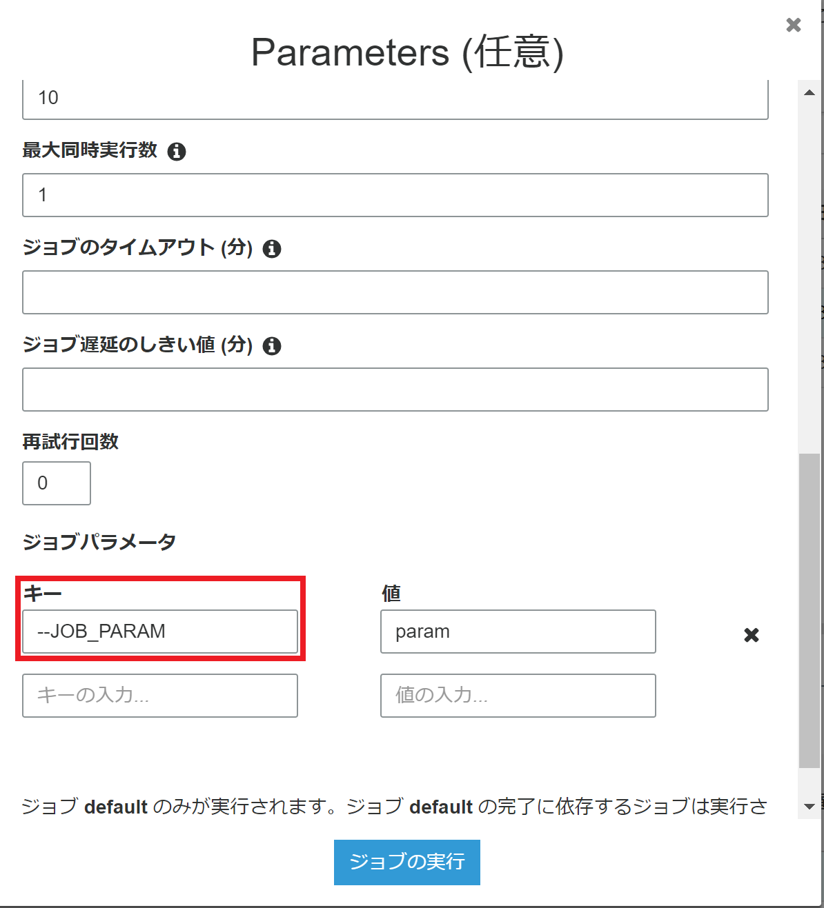 Glue のジョブを実行する際にジョブのパラメータを指定できる。