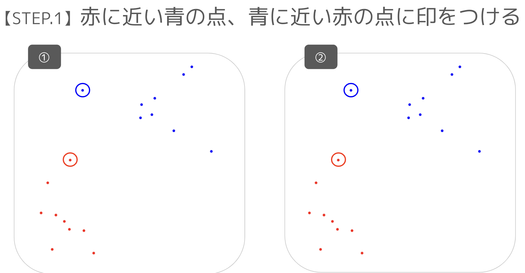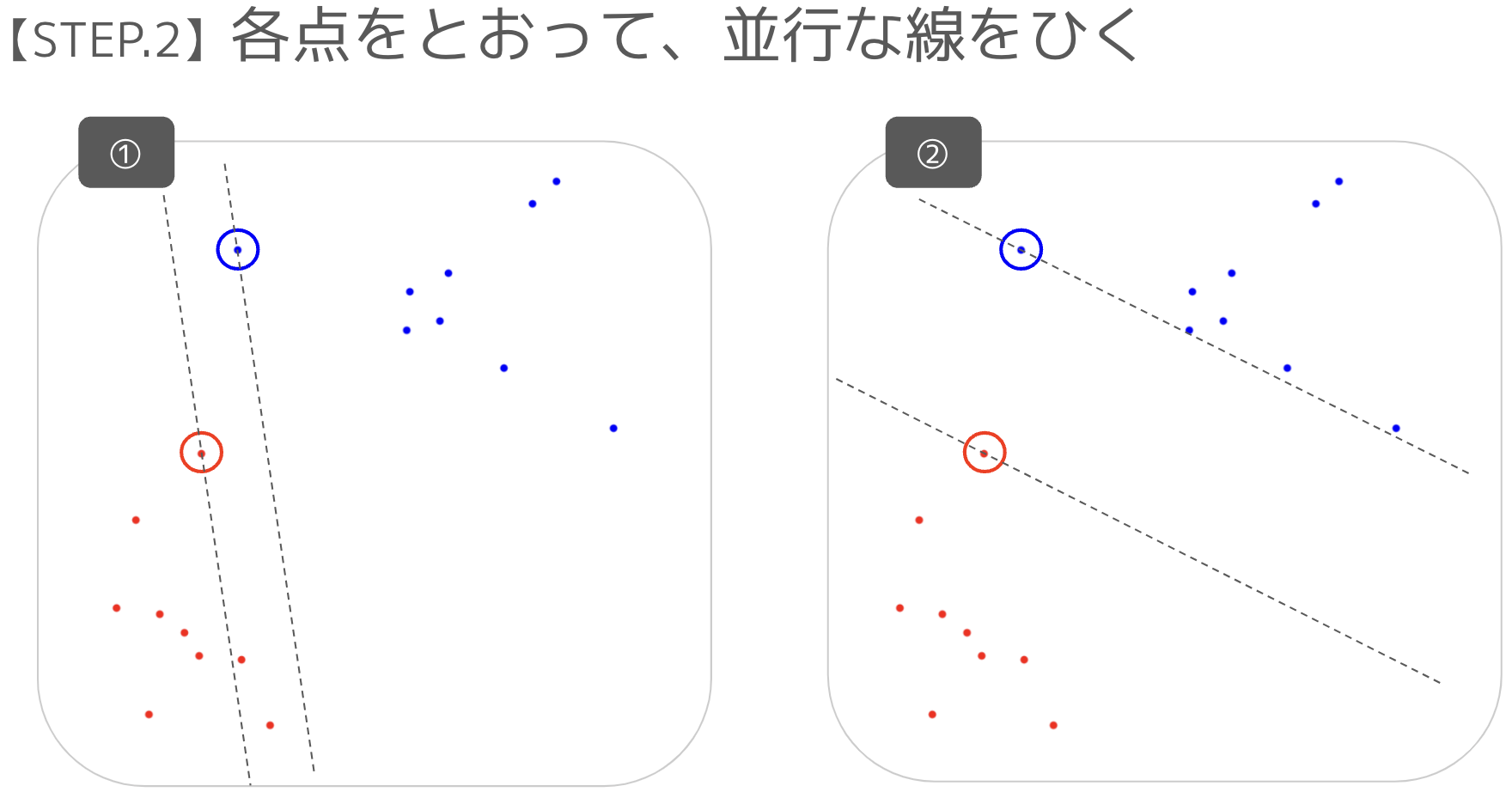 赤色の点の集まりと、青色の点の集まりを分けたく、分割する線を引くことにした。