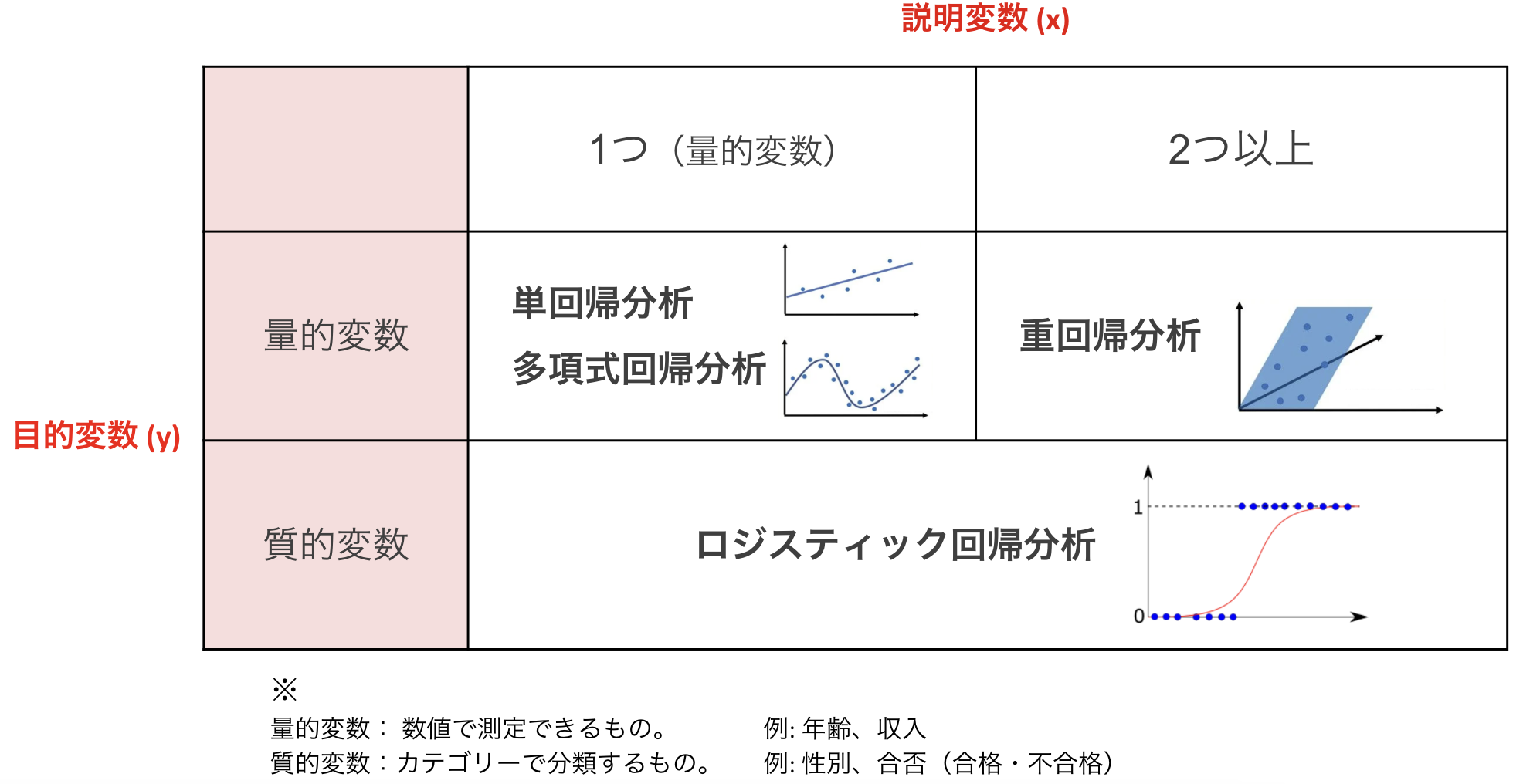 単回帰、重回帰との違いも踏まえながらまとめると以下のようになる。
