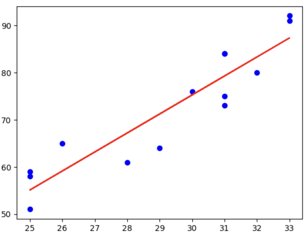 こちらのプロットした値に対して、回帰分析をすると赤線のグラフが得られると考えられる。